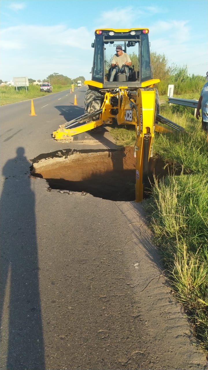 Se recibe llamado por parte de transeúntes de la ruta informando sobre el desmoronamiento de la calzada por donde pasa el canal aliviador local, producto del cuál se produjo un gran orificio donde varios conductores debieron realizar maniobras peligrosas para esquivarlo. Al arribo de las dotaciones ya se encontraba en el lugar personal del consorcio canalero. Se procede al balizamiento y control del tráfico en conjunto con personal policial local y de caminera.