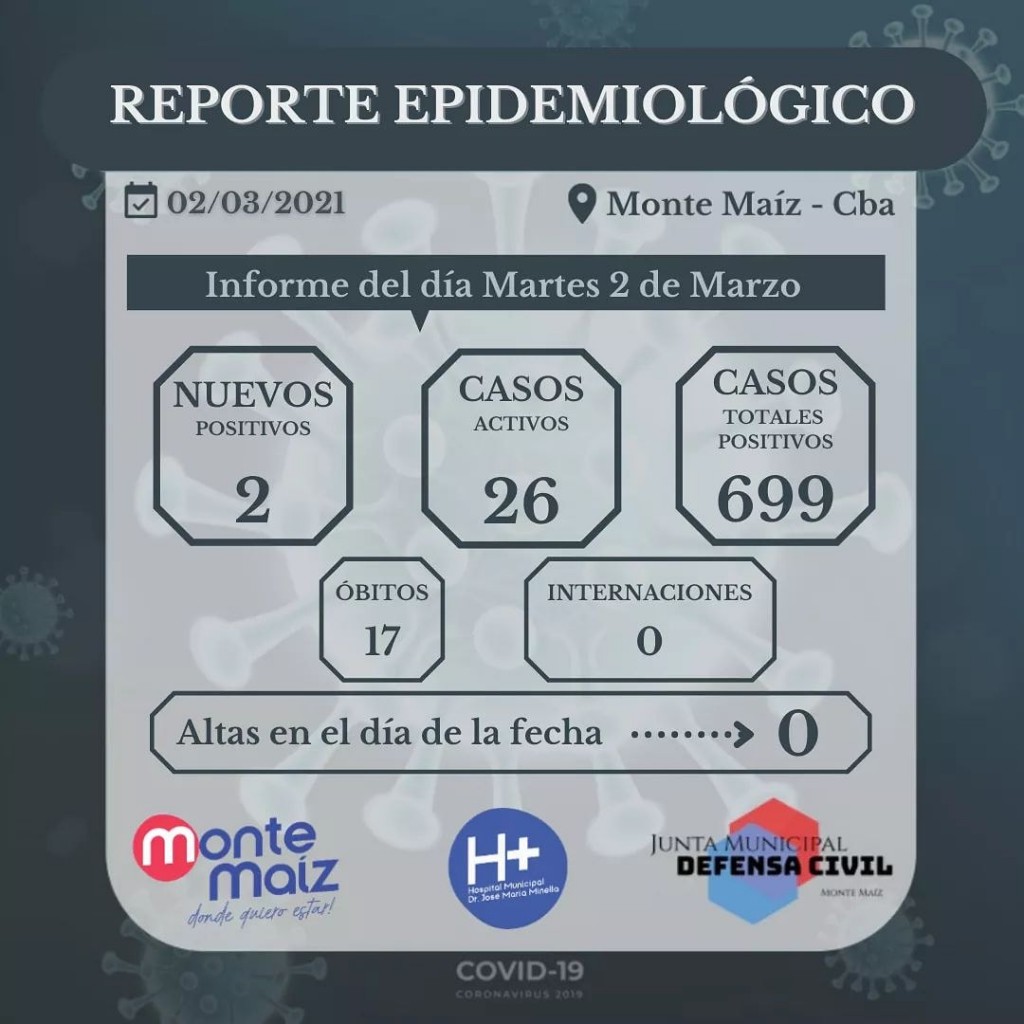 Desde el Hospital Municipal se reportaron 2 casos nuevos de COVID-19 en Monte Maíz. De esta manera se contabilizan 699 casos desde el comienzo de la pandemia.