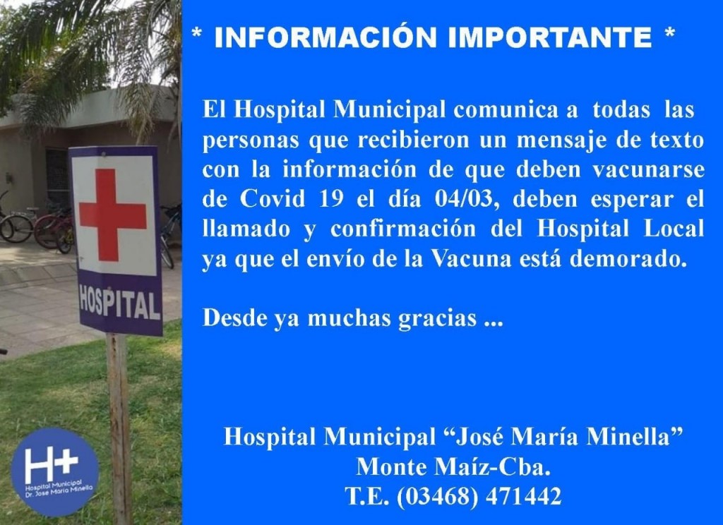 El Hospital Municipal Dr. José María Minella informa a la población que quienes hayan recibido un mensaje de texto con la información de que deben vacunarse de COVID-19 hoy jueves 4 de marzo, deberán esperar el llamado y la confirmación del Hospital local.