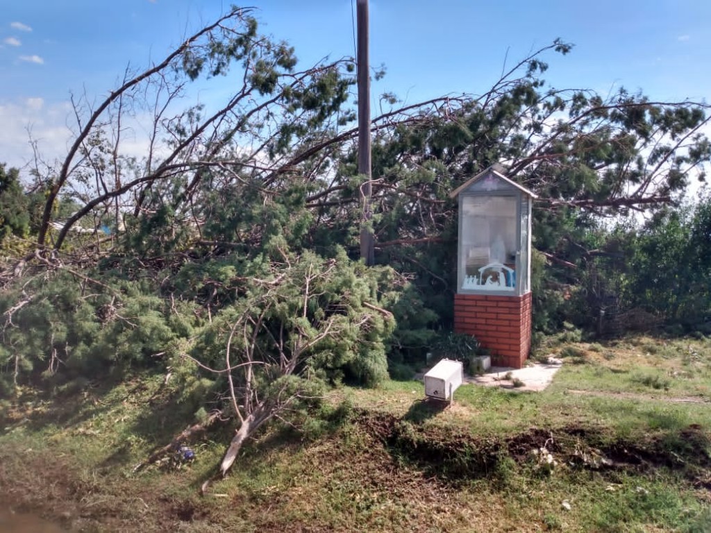 El tornado del domingo 28 de febrero también ocasionó graves daños en la localidad de Colonia Bismarck. Hubo caída de innumerables pinos en el acceso a la localidad y entre el viento y el granizo dañaron la ermita de la Virgencita del Luján que está siendo restaurada por algunos daños sufridos.