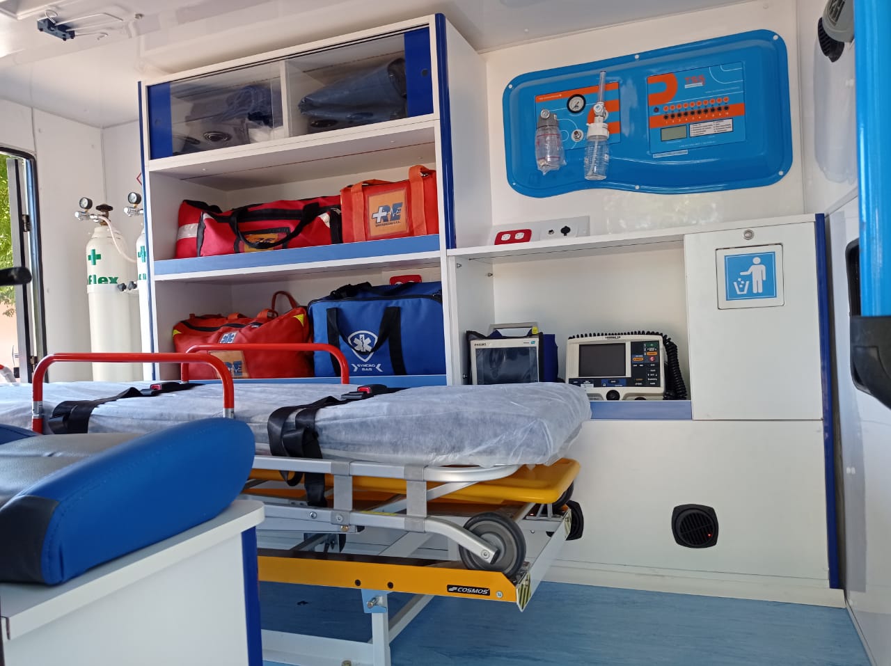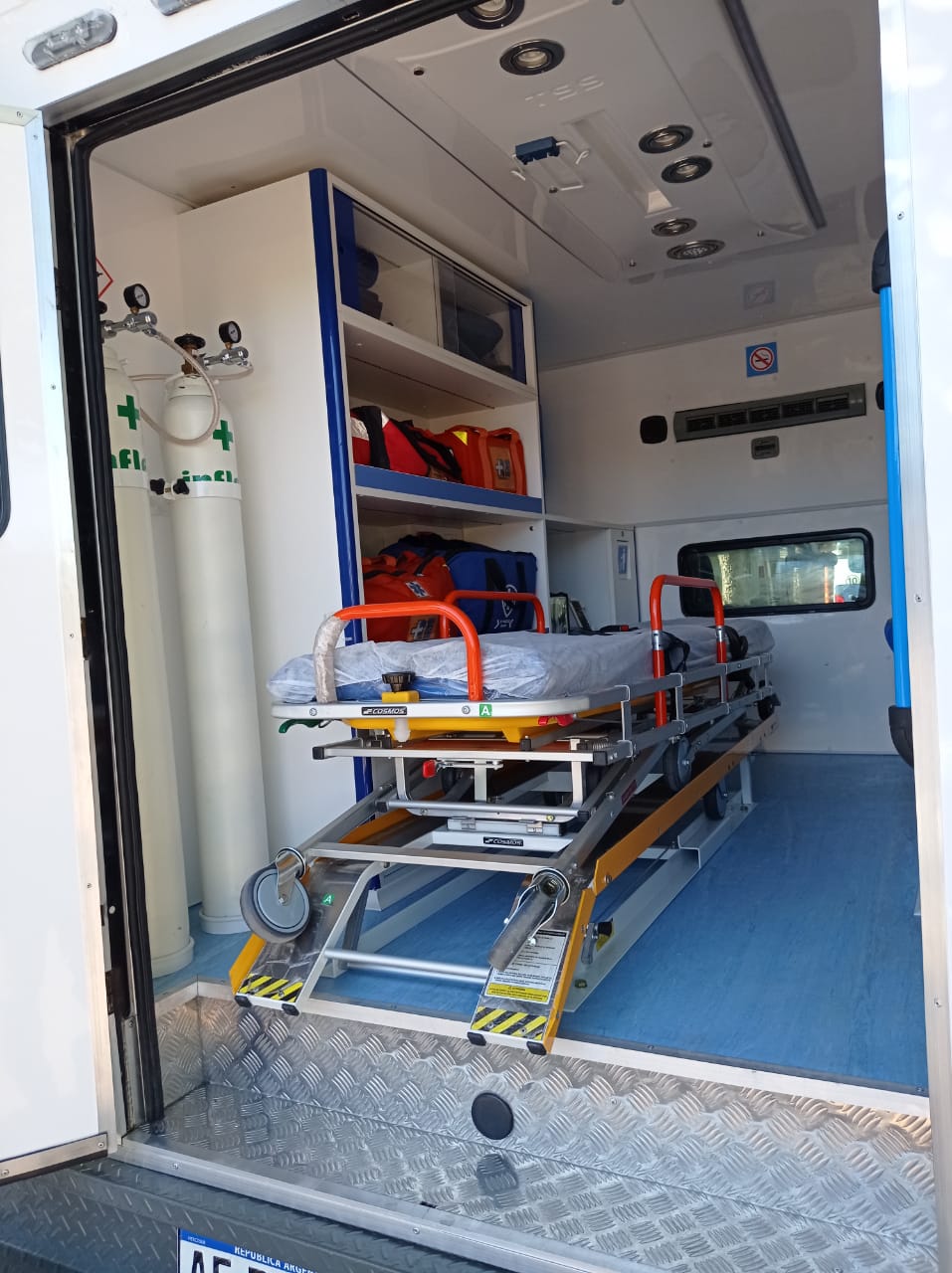 Cuenta con equipamientos de última tecnologías y luminarias led. Está equipada con una camilla retráctil con suspensión para evitar esfuerzos para quien la utiliza y viene con una cámara de descontaminación de Covid y de cualquier tipo de bacteria, hongo o virus. Tal cámara ya viene instalada en el vehículo.
