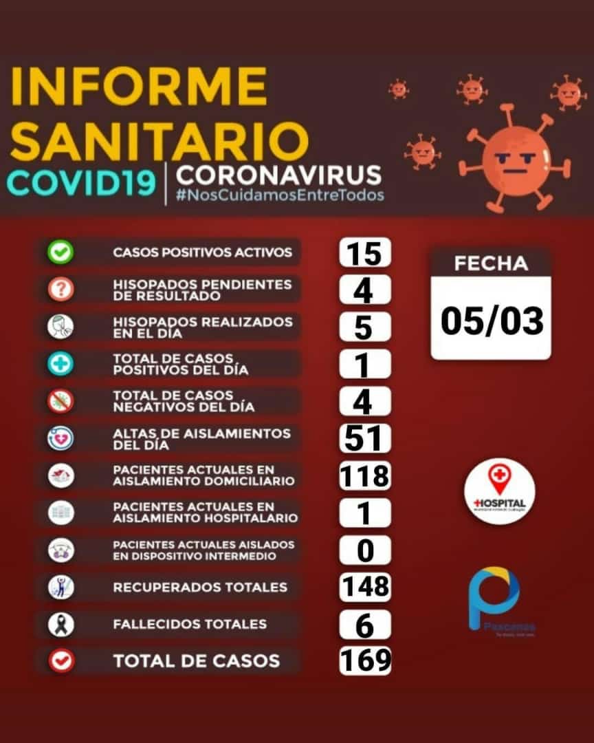 De esta manera, se contabilizan 711 casos desde el comienzo de la pandemia. Hay 26 casos activos ya que ayer a la mañana 10 pacientes recibieron el alta de aislamiento. A la fecha, no hay pacientes internados pero se contabilizan 17 personas fallecidas a causa de la enfermedad.