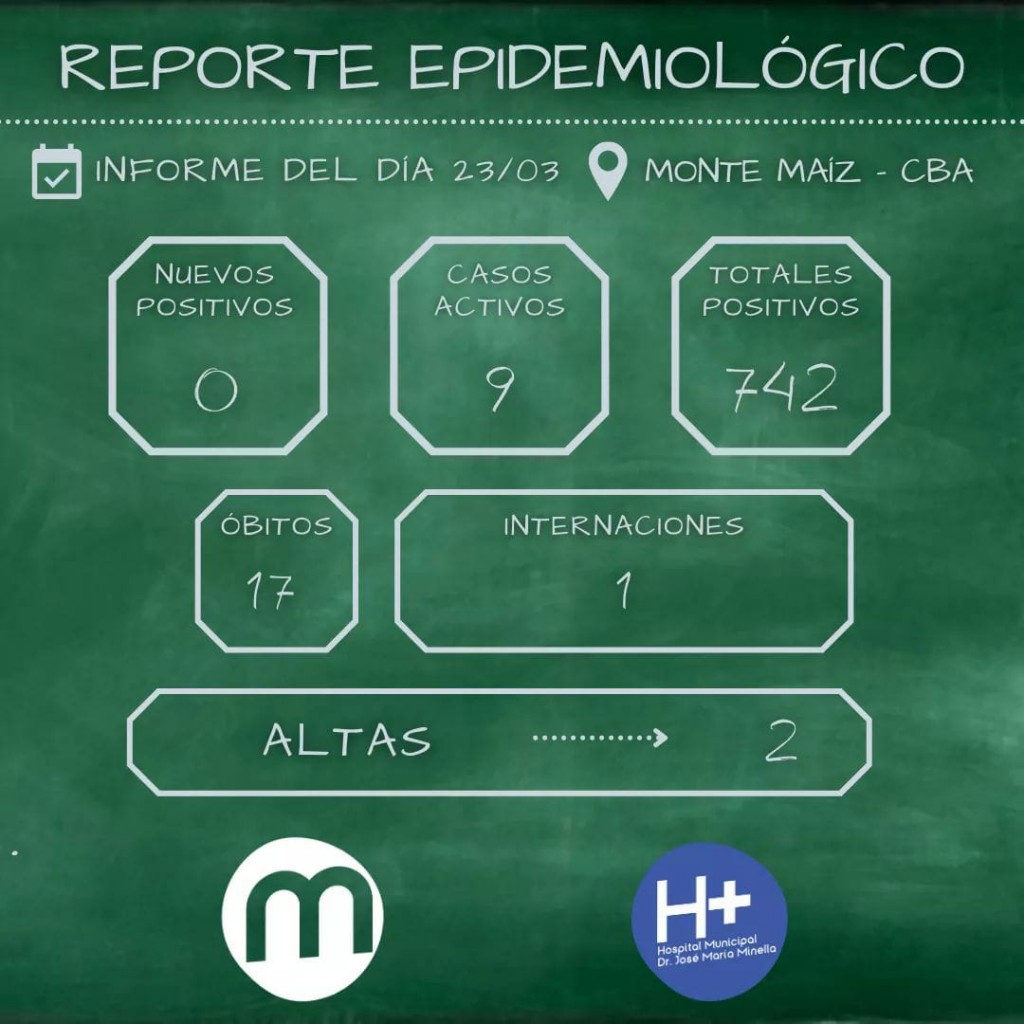 En las últimas horas del martes, el Hospital Municipal de Monte Maíz informó que uno de los pacientes que se encontraba aislado con COVID-19 debió ser internado. Además se informó sobre dos altas más de pacientes que se encontraban cumpliendo aislamiento. Por lo tanto, a la fecha, son 9 los casos activos en nuestra localidad.