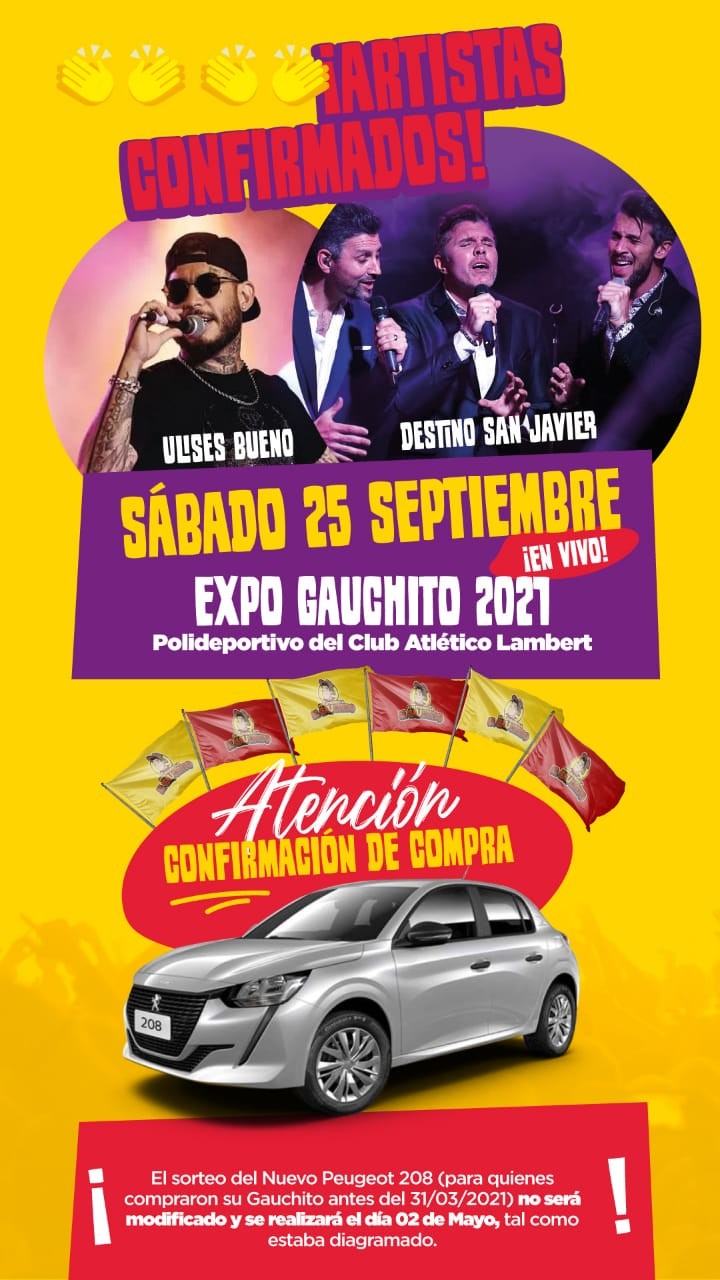 La novedad es que ese mismo día se presentarán los dos espectáculos programados por la Súper Tómbola El Gauchito. Estarán Ulises Bueno y Destino San Javier. Tal presentación será en el marco de la Expo en el Poli Deportivo del Club Atlético Lambert.