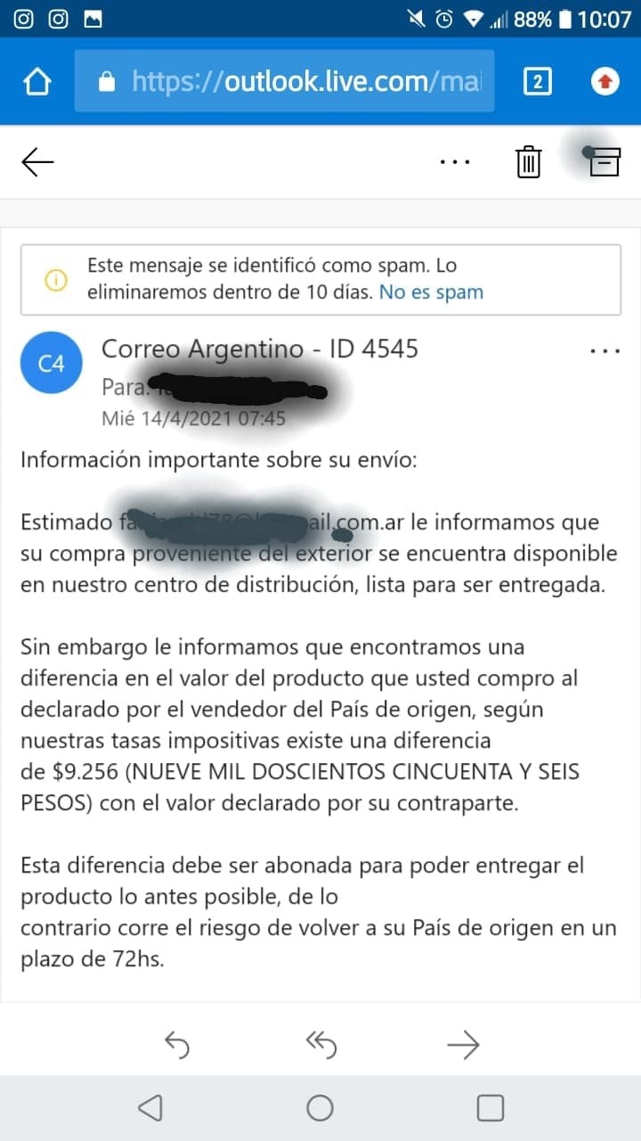 En esta caso, se reciben correos electrónicos en donde se informa al usuario que su compra en el exterior ya está lista aunque hay una diferencia de precio que pagara para que se dé curso a la misma.