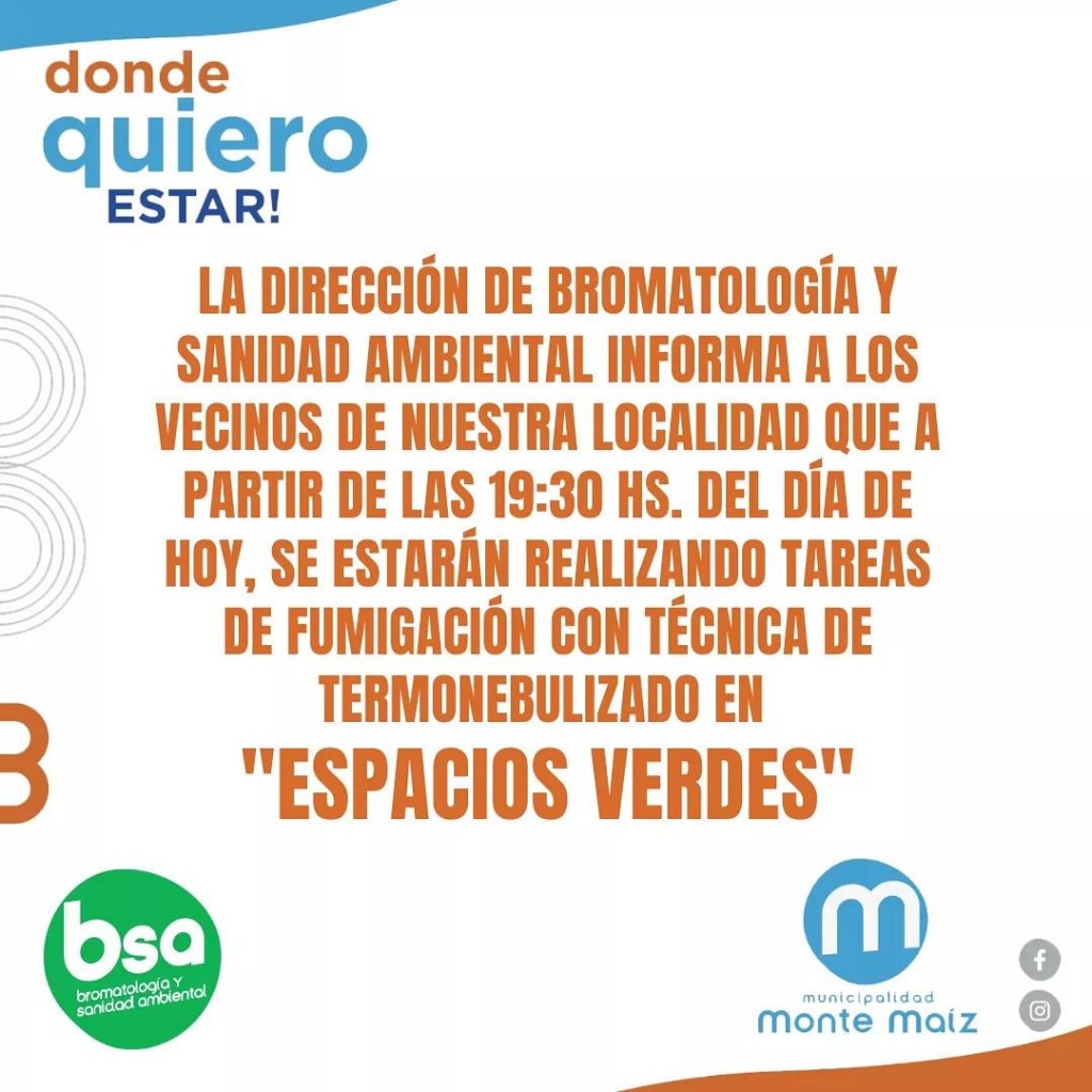 La Dirección de Bromatología y Sanidad Ambiental informa a los vecinos de nuestra localidad que a partir de las 19:30 hs. del día de hoy, se estarán realizando tareas de fumigación con técnica de termonebulizado en espacios verdes.