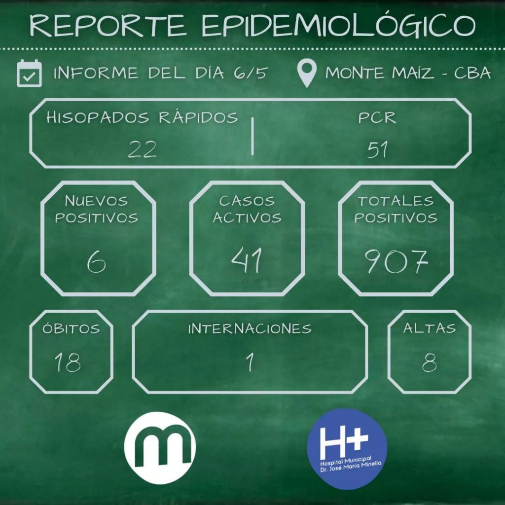 El informe epidemiológico local informó 6 casos nuevos de COVID-19 en Monte Maíz. Además se dio de alta a 8 pacientes que estaban cumpliendo aislamiento domiciliario. De esta manera se contabilizan 907 casos desde el comienzo de la pandemia. Hay 41 casos activos y uno de los pacientes se encuentra internado. Los datos también indican que en el día de ayer se hicieron 22 hisopados rápidos y 51 hisopados PCR. A la fecha, 18personas fallecieron a causa de la enfermedad.