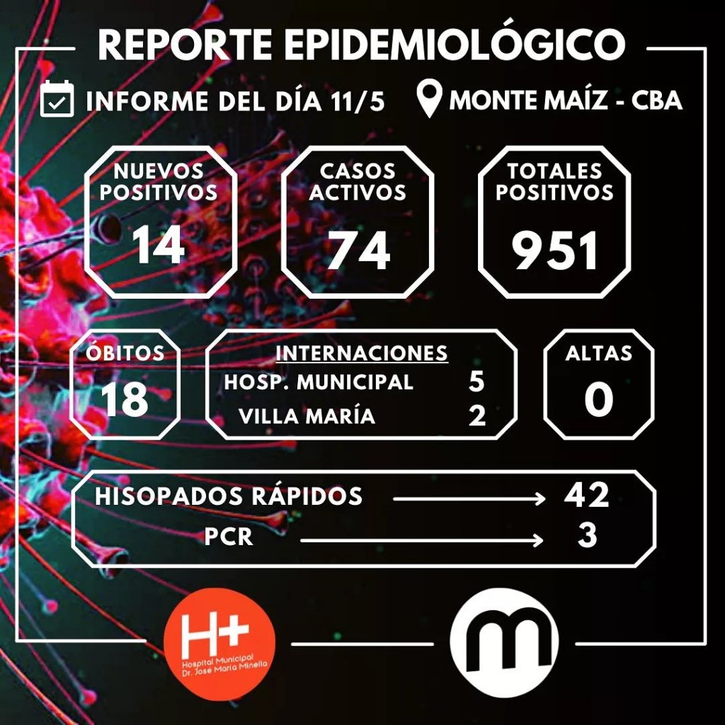 En la tarde de este martes se confirmaron 14 casos más de COVID-19 en Monte Maíz. Lo cual eleva a 74 los casos activos con 5 pacientes internados en el Hospital Municipal y 2 pacientes que debieron ser derivados a la ciudad de Villa María.