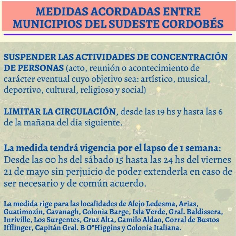 Estas medidas rigen para las localidades de Alejo Ledesma, Arias, Guatimozín, Cávanagh, Colonia Barge, Isla Verde,General Baldissera, Inriville, Los Surgentes, Cruz Alta, Camilo aldao, Corral de Bustos Ifflinger, Capitán Bernerdo O´Higgins y Colonia Italiana.