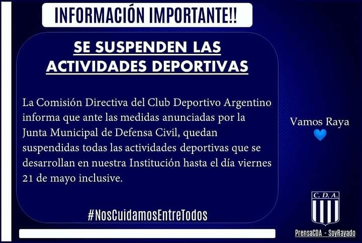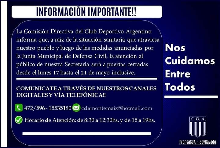 Desde este lunes 17 hasta el viernes 21 de mayo inclusive, la Mutual de Asociados del Club Deportivo Argentino trabajará a puertas cerradas.