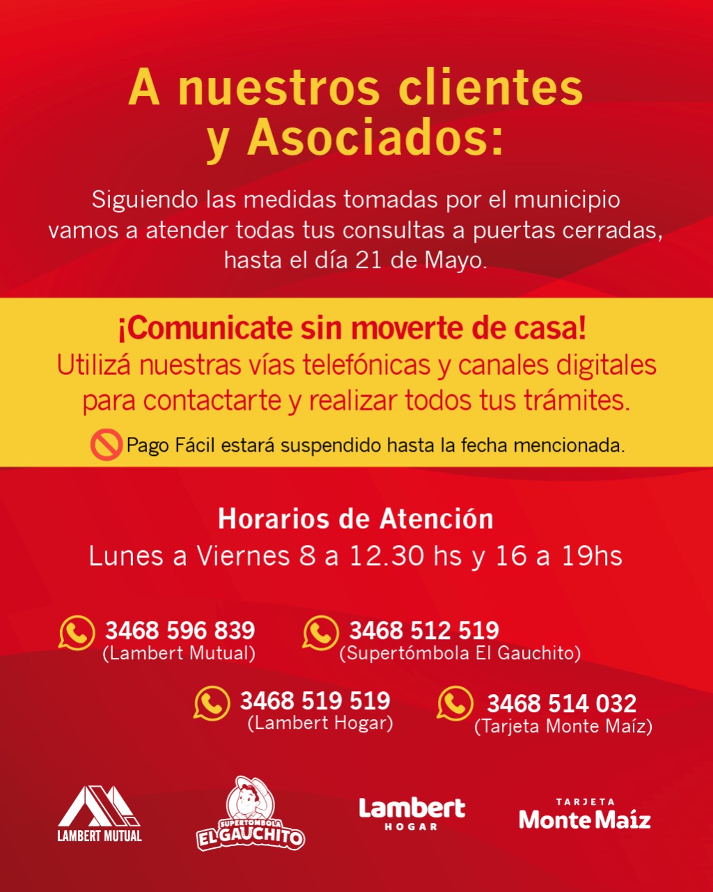 Hasta el 21 de Mayo, nuestros espacios y oficinas prestarán atención a puertas cerradas.