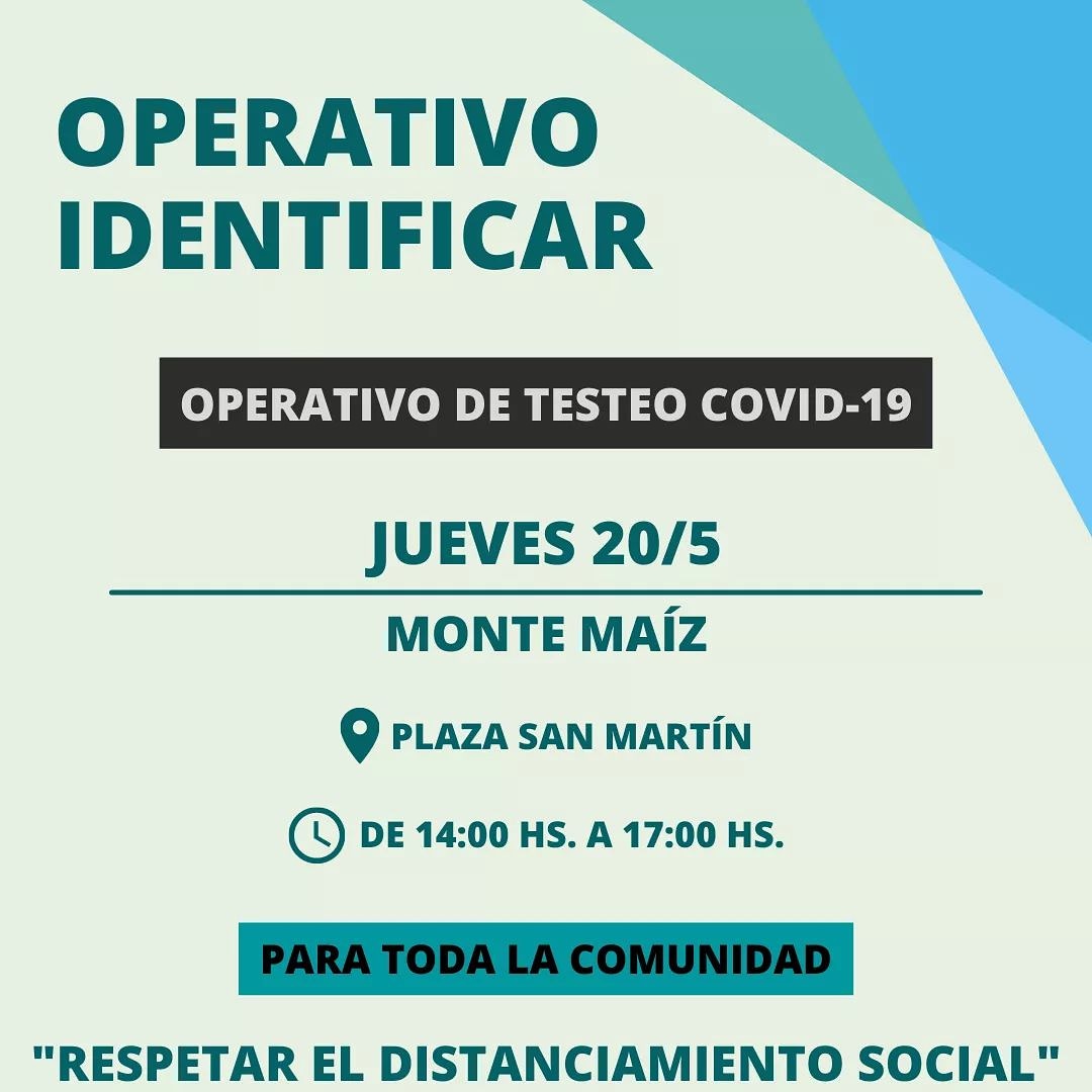 También se informó que en el dia de hoy llega el Operativo Identificar del Ministerio de Salud de la provincia. Se trata de un programa de testeos masivos que se desarrollará en la plazade 14 a 17 horas. El mismo es voluntario y para toda la comunidad. Para quien desee hacerse el control correspondiente se ruega asistir repetando todas las medidas de seguridad y de prevención vigentes.