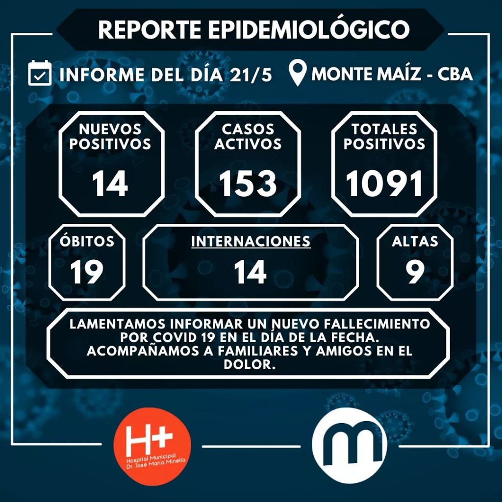 Desde el Hospital Municipal se informaron 14 casos nuevos de COVID-19 en Monte Maíz. Así mismo, se dieron de alta a 9 pacientes que se encontraban cumpliendo aislamiento domiciliario. En el día de ayer se produjo un nuevo fallecimiento a causa de la enfermedad lo que eleva la cifra a 19 decesos desde el comienzo de la pandemia.