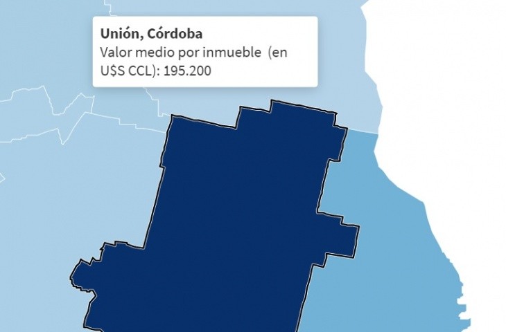 A partir del informe elaborado se puede ver además que el valor promedio de una propiedad en Córdoba ronda los US$ 68.000, encontrando su valor máximo en propiedades del Departamento Unión, que tiene como ciudad cabecera a Bell Ville, pero que está conformado además por Ascasubi, Ballesteros, Litín y Loboy. En este departamento el valor promedio de un inmueble es de US$ 195.000, mientras que en el Departamento Ischilín es de US$ 22.000, representando el valor mínimo.