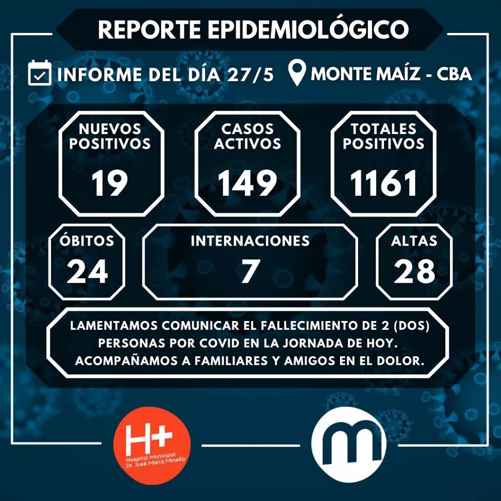 Desde el Hospital Municipal se informaron 19 casos nuevos de COVID-19 en Monte Maíz y 2 nuevos fallecimientos. 28 pacientes recibieron el alta de su aislamiento domiciliario.