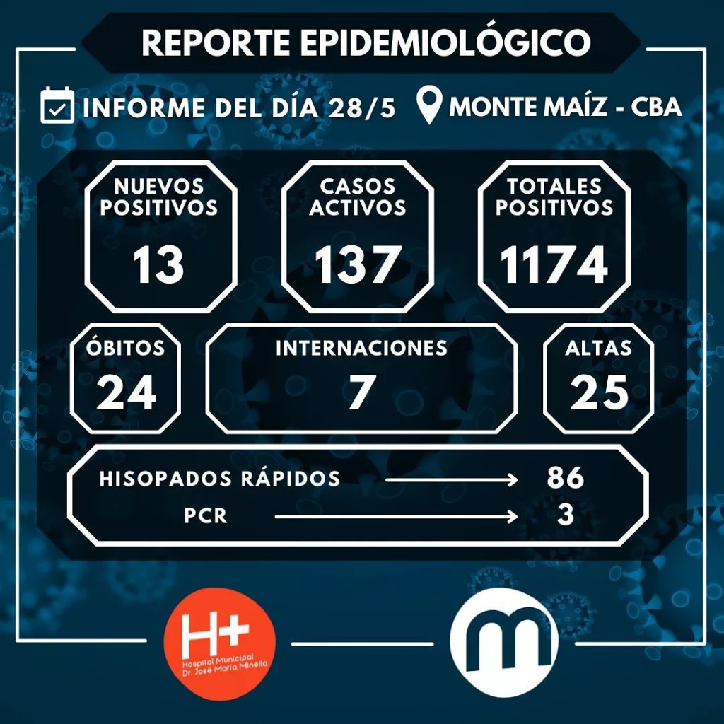 Desde el Hospital Municipal se confirmaron 13 casos nuevos de COVID-19 en Monte Maíz. Se practicaron 86 hisopados rápidos y 3 por PCR. Se dieron 25 altas a pacientes que se encontraban cumpliendo con el aislamiento domiciliario.