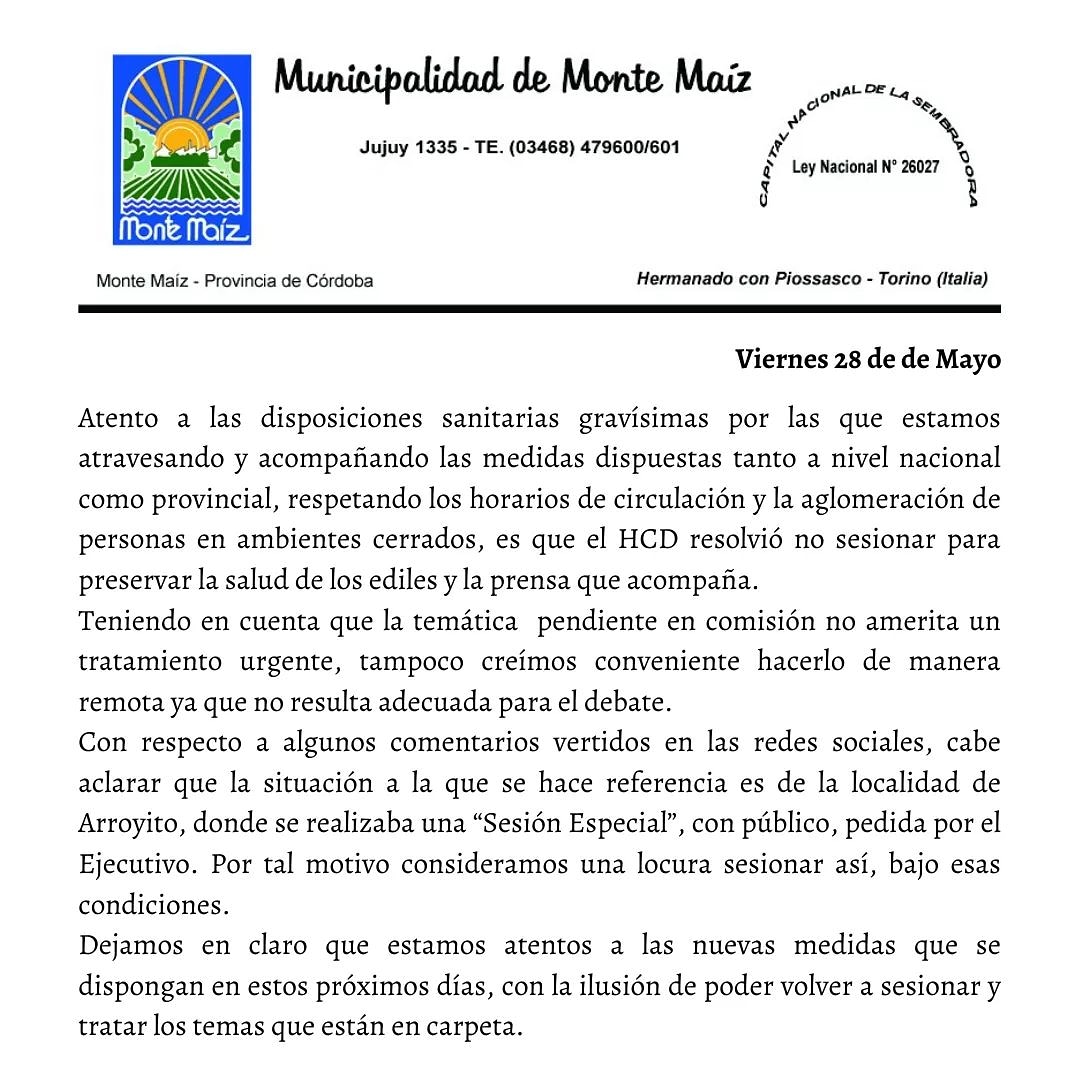 Desde la Municipalidad de Monte Maíz se informó que el Honorable Concejo Deliberante decidió no sesionar por la crisis sanitaria que atraviesa nuestro pueblo y la región. Y, en concordancia con las medidas preventivas que rigen en el país y en la provincia, se considera necesario preservar la salud de los concejales y de la prensa que cubre cada una de las sesiones.