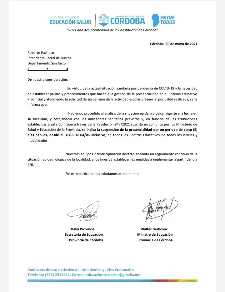 El intendente municipal, había hecho el pedido formal en días pasados y el Ministerio de Educación junto al Ministerio de Salud de la Provincia de Córdoba, emitieron la resolución 947/2021 a última hora de este domingo.