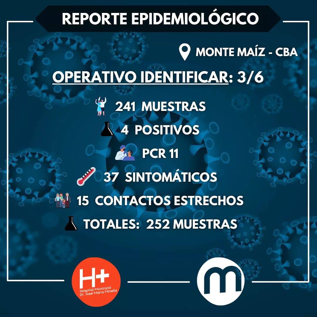 Desde el Hospital Municipal se confirmaron 9 casos nuevos de COVID-19 en Monte Maíz. Por la mañana se practicaron 32 hisopados rápidos. Mientras que por la tarde, en el Programa “Identificar”, se practicaron 241 hisopados de los cuales solo 4 dieron resultados Positivos. Además, se hicieron 11 hisopados PCR.