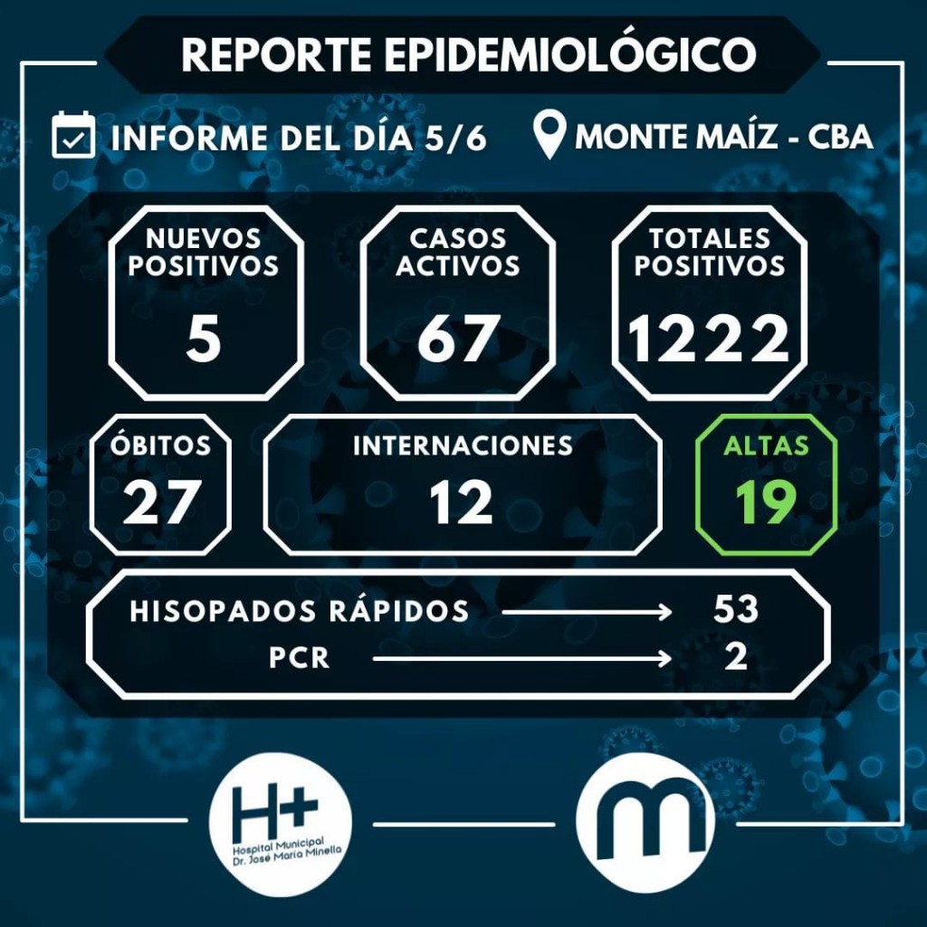 El informe epidemiológico emitido en la noche de hoy confirmó 5 casos nuevos de COVID-19 en Monte Maíz y 2 nuevos fallecimientos. Se trata de dos mujeres de 71 y de 95 años de edad.
