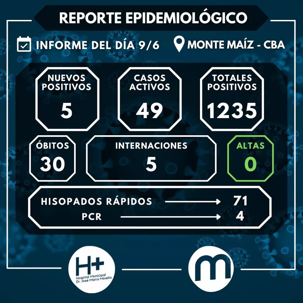 Desde el Hospital Municipal se reportaron 5 nuevos casos de COVID-19 en Monte Maíz. En el día de ayer no hubo altas médicas con lo cual suman 49 los casos activos.