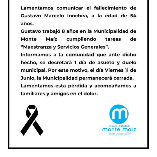 Por tal motivo, el Municipio decretó un día de asueto y 24 hs. de duelo Municipal con lo cual mañana no habrá atención al público.
