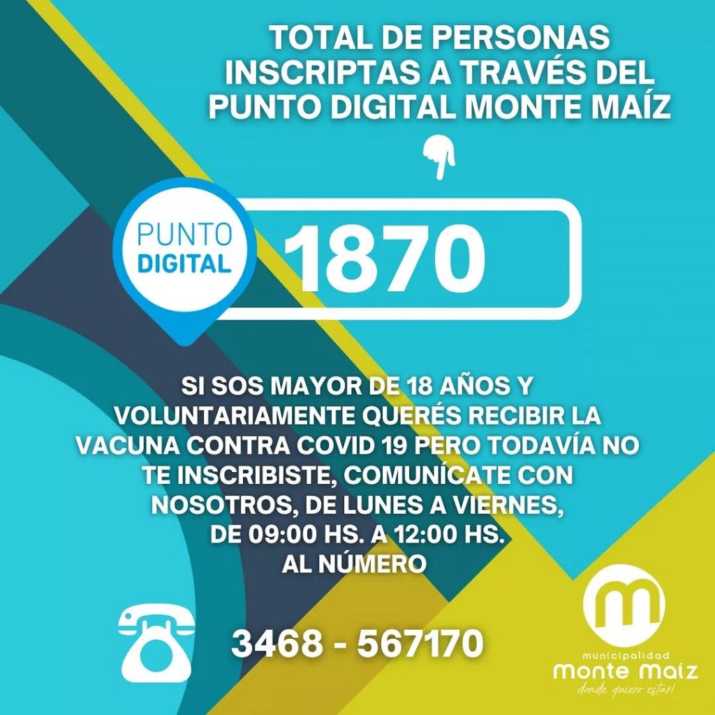 En la mañana del lunes se informó a la población que todos aquellos jóvenes desde 18 años que aún no se han anotado para vacunarse a través de la plataforma CIDI (Ciudadano Digital) del gobierno de la provincia de Córdoba, pueden comunicarse al teléfono: 3468-567170 en donde serán inscriptos para poder vacunarse de manera voluntaria contra el COVID-19.