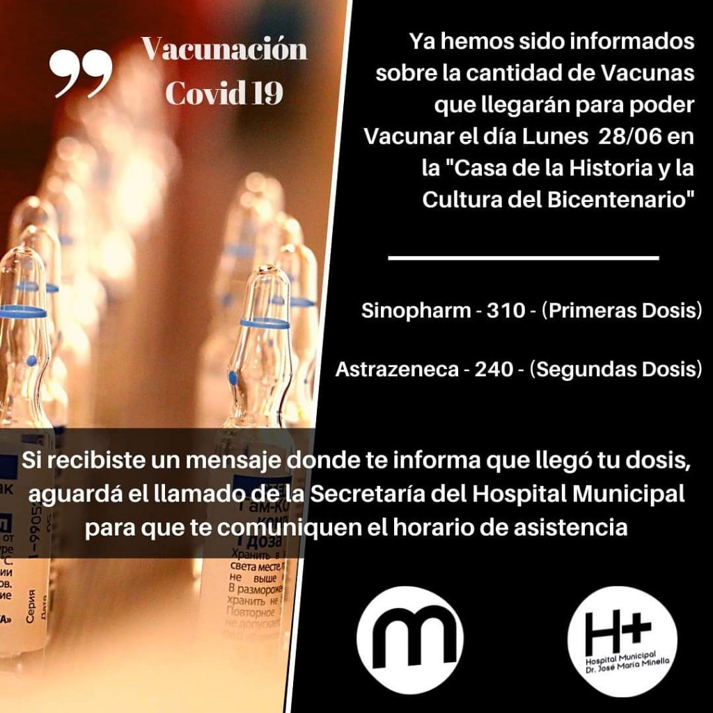 Desde el Hospital Municipal se informó que llegaron 550 dosis de vacunas a nuestra localidad. Se trata de 310 dosis de Sinopharm, primer componente y 240 dosis de AstraZeneka, segundo componente.
