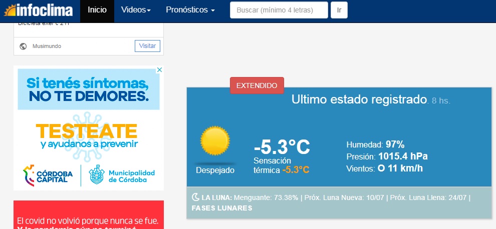 LA PÁGINA DE INFOCLIMA REGISTRÓ MÁS DE 5 GRADOS BAJO CERO DE SENSACIÓN TÉRMICA