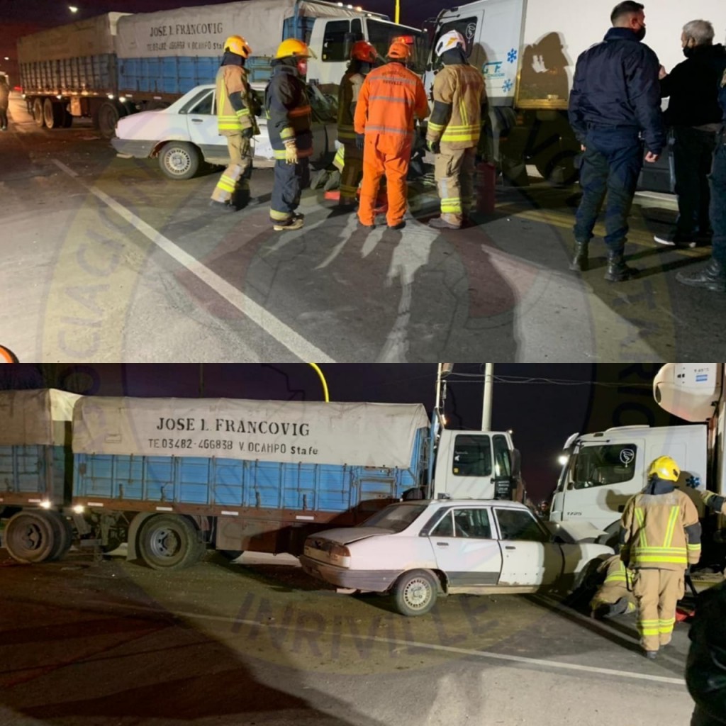 Por causas que se tratan de establecer, colisionaron dos camiones que circulaban por la ruta y un automóvil Peugeot 504 con cuatro ocupantes, que lo hacía desde zona sur a zona norte.