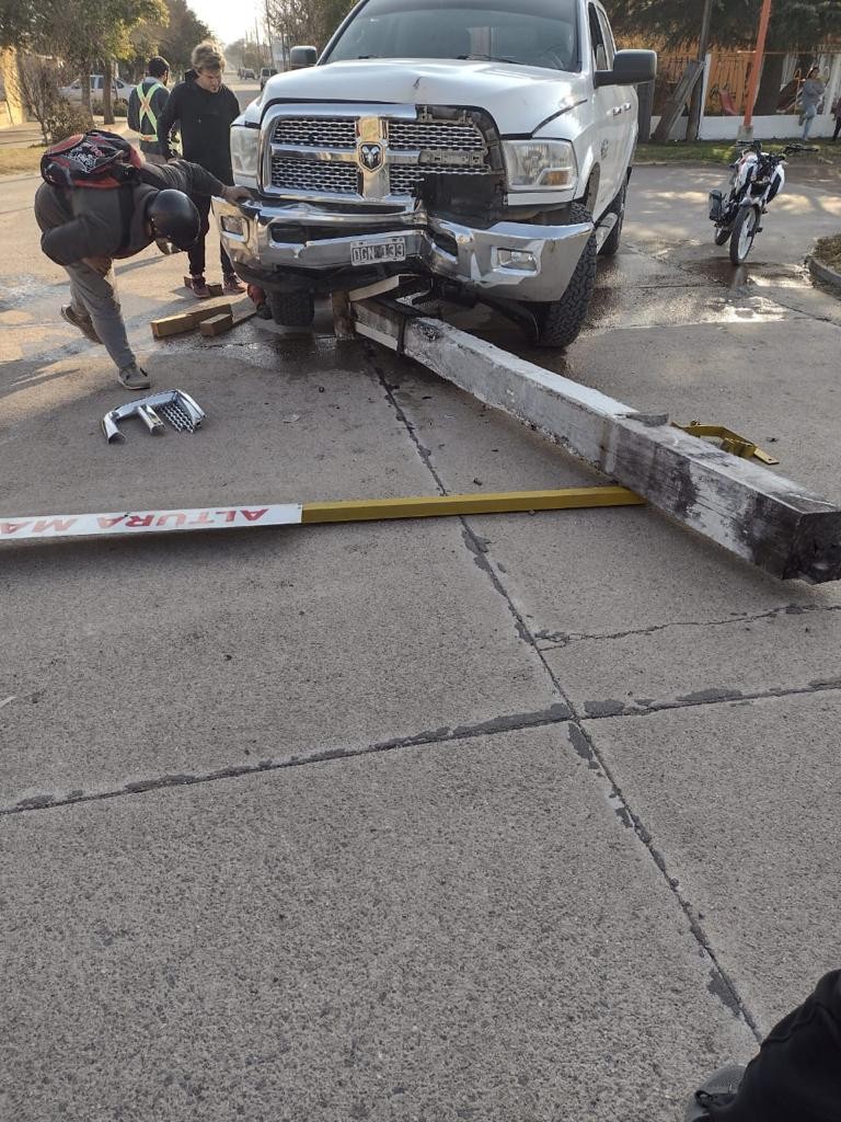 En la tarde de este miércoles una persona que se conducía en una camioneta y venia por calle Antártida Argentina, doblo por calle 9 de Julio para tomar Avda. Circunvalación y se chocó el poste que hay en el medio de la calle justo en la salida.