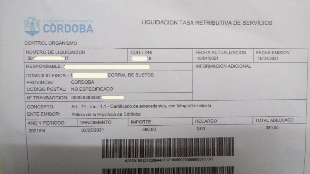Un vecino de Corral de Bustos Ifflinger, espera desde el mes de Abril su Certificado de Antecedentes que solicitó a través de la página web oficial de la Policía de Córdoba y por cuyo trámite ya abonó los $380 de la tasa retributiva con su tarjeta de crédito. Lo más irrisorio es que en el comprobante emitido una vez que realizó el trámite y el pago dice que la documentación que se le va a emitir tiene vencimiento el 3 de Mayo.