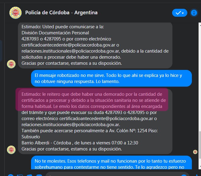 A decir verdad solo recibimos una respuesta personalizada vía Messenger de la Página de la policía de Córdoba que muy atentamente nos indica que nos debemos comunicar a las mismas vías de contacto que tanto el vecino como EL SOBERANO, hicimos anteriormente y QUE NO FUNCIONAN, es decir: Nos informan que nos comuniquemos con teléfonos y mails QUE NO ANDAN.
