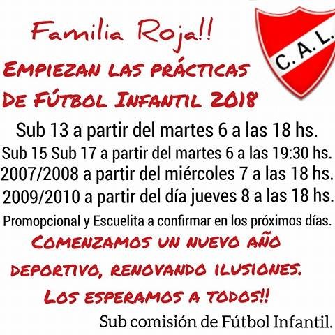 La Subcomisión de Fútbol Infantil del Club Atlético Lambert informa que mañana martes comienzan las prácticas en Categorías Sub 13 a partir de las 18:00 hs. y Sub 15 a partir de las 19:30 hs. El miércoles 07 de febrero se sumarán las Categorías 2007 y 2008 a partir de las 18:00 hs. En tanto, las Categorías 2009 y 2010 comienzan a trabajar el día jueves 08 a partir de las 18:00 hs. En los próximos días se dará a conocer el comienzo de actividades en las Categorías menores, Promocional y Escuelita.