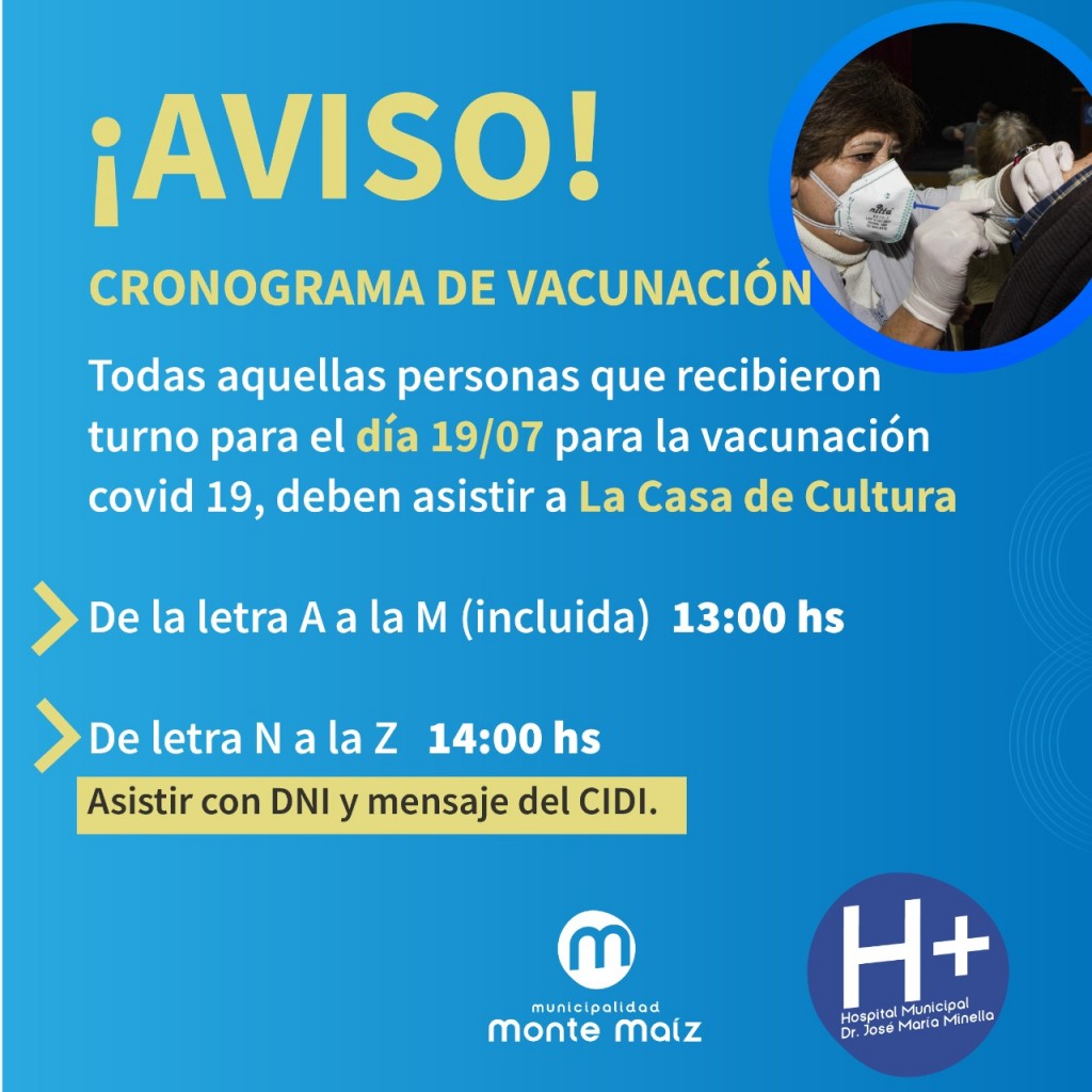 El Hospital Municipal informa a la población que todas aquellas personas que hayan recibido el turno de vacunación contra el COVID-19 deberán asistir a la Casa de la Cultura: