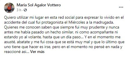 En un descargo que hizo a través de su cuenta de Facebook expresó que es la primera vez que protagoniza un hecho de estas características y que por eso se asustó y se fue del lugar. Aunque reconoció que se equivocó: “no es lo que se debe hacer en una situación así”.