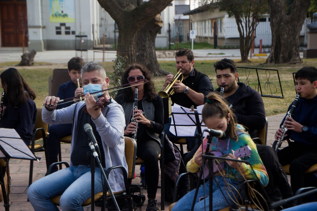 La escuela de Música y Banda Municipal ensayó al aire libre en la plaza José de San Martín de nuestra localidad.