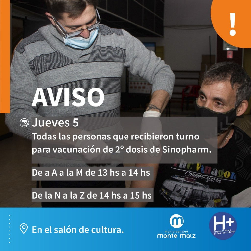 En el día de hoy se aplicarán segundas dosis de la vacuna Sinopharm. Todas aquellas personas que hayan recibido la notificación deberán presentarse en la Casa de la Cultura en los siguientes horarios:
