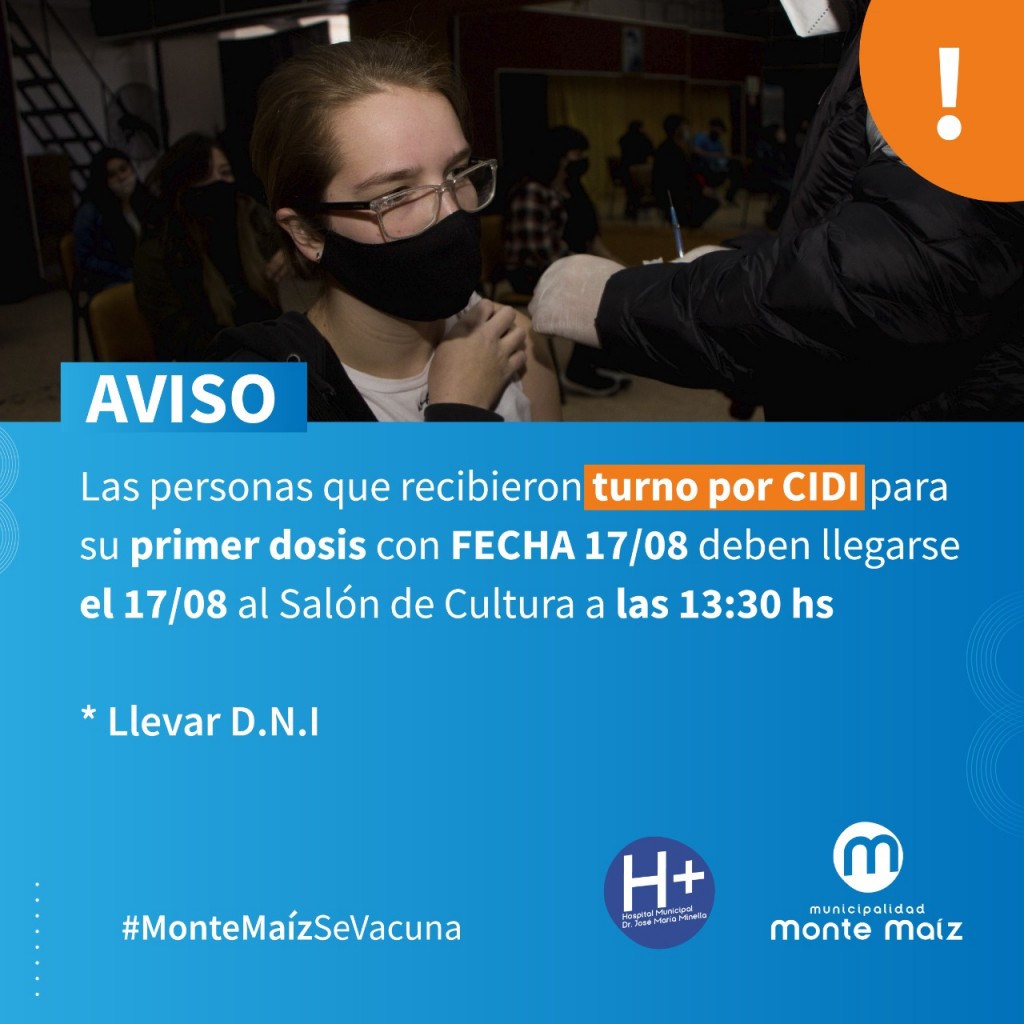 El Hospital Municipal informa a la población que quienes hayan recibido la notificación a través del CIDI (Ciudadano Digital) para recibir la primera dosis de la vacuna contra el Covid-19 deben presentarse mañana, 17 de agosto, en la Casa de la Cultura a las 13:30 hs. con DNI.