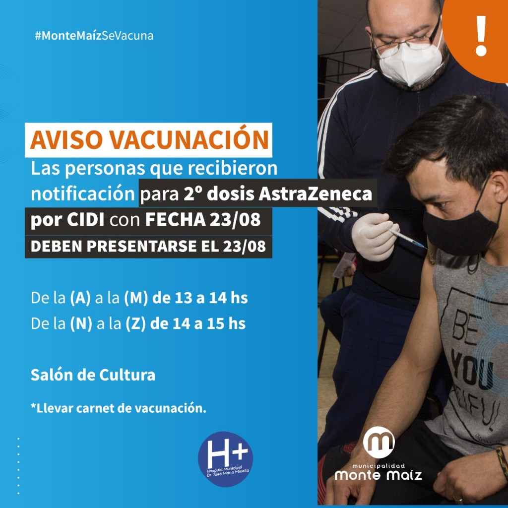 El Hospital Municipal informa a la población que las personas que hayan recibido la notificación para la segunda dosis de la vacuna AstraZeneca para el día 23 de agosto, deberán presentarse mañana en la Casa de la Cultura en los siguientes horarios: