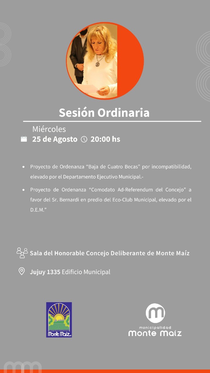 La presidenta del honorable concejo Deliberante de Monte Maíz, Prof. María Luisa Mottura, llamó a sesión ordinaria para hoy, miércoles 25 de agosto, a las 20:00 hs.