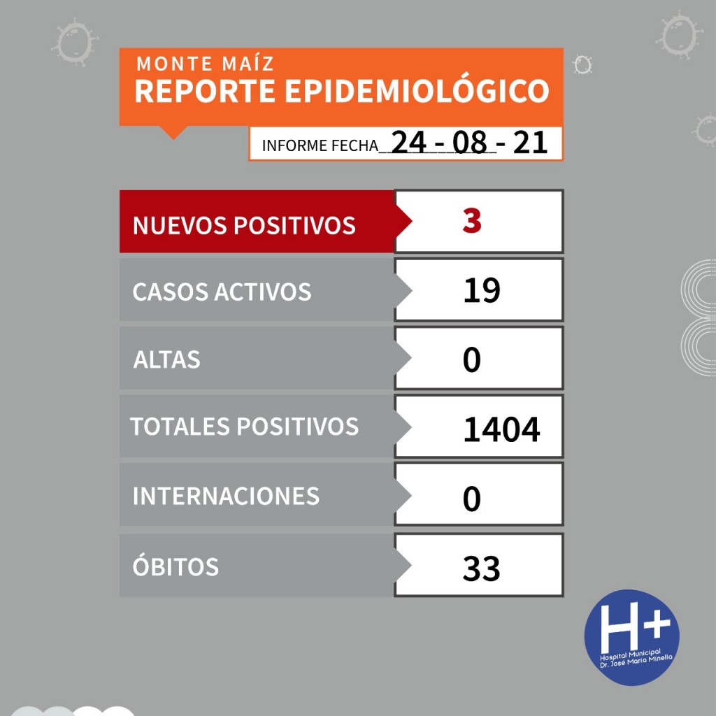 En el mediodía de hoy miércoles se emitió un nuevo reporte epidemiológico correspondiente al martes 24 de agosto de 2021. En el mismo, se confirmaron 3 casos nuevos de COVID-19 en nuestra localidad.