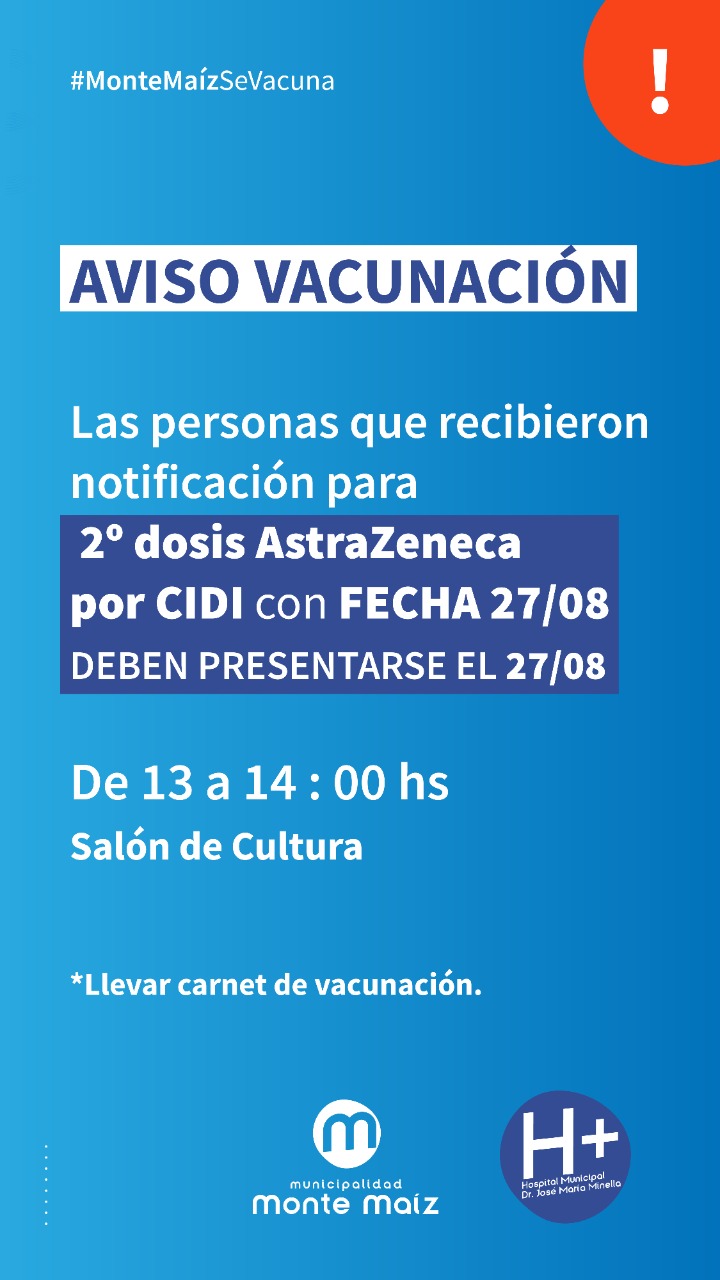 Desde el Hospital Municipal se informa a la población que quienes hayan recibido la notificación a través de CIDI (Ciudadano Digital) para la segunda dosis de la vacuna AstraZeneka, para el viernes 27 de agosto, que deben presentarse en la Casa de la Cultura hoy a las 13:00 hs. con el carnet de vacunación.