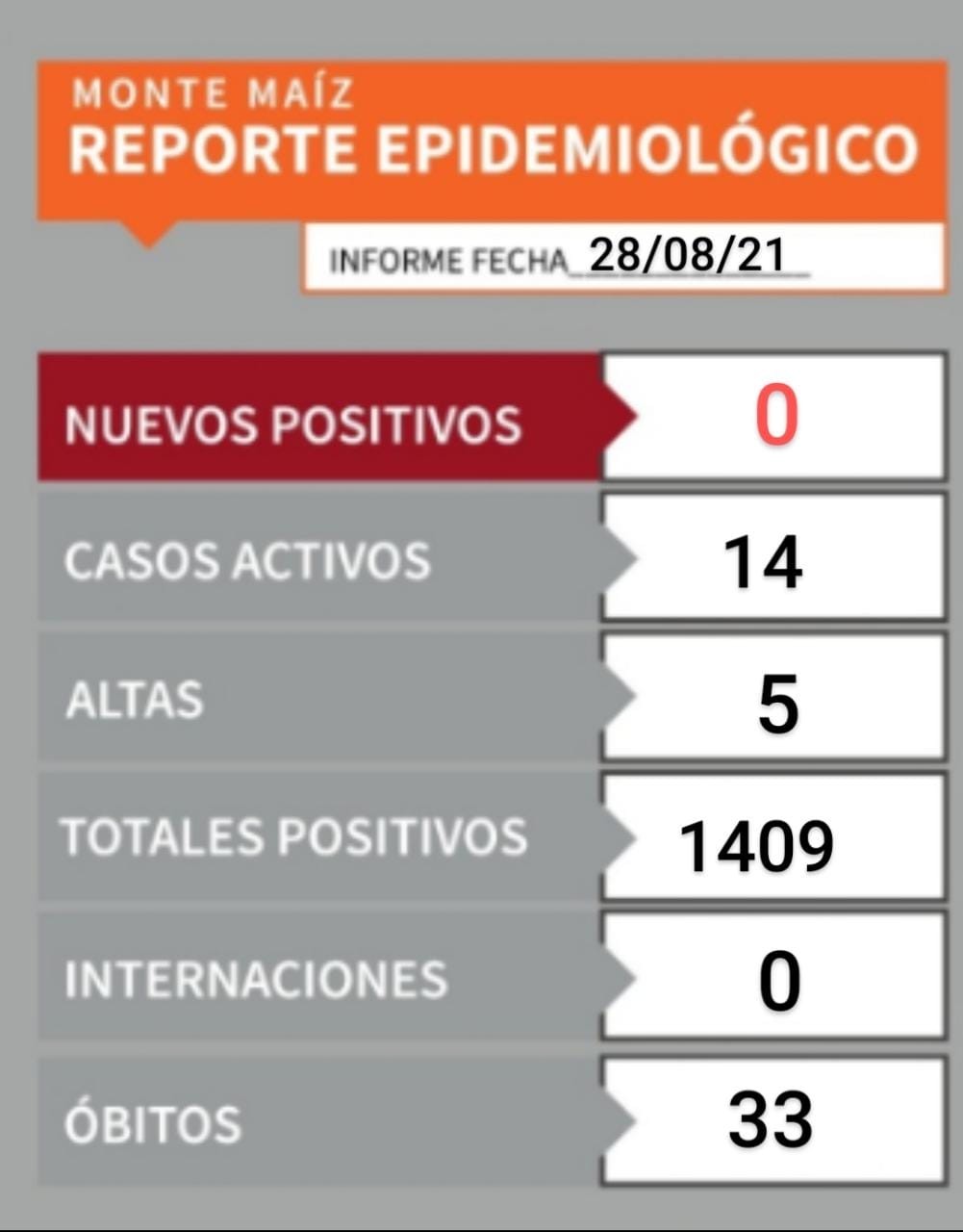 El informe epidemiológico local indicó que no hubo nuevos contagios de COVID-19 en las últimas horas en Monte Maíz. Se dieron 5 altas a pacientes que se encontraban cumpliendo con el aislamiento domiciliario.