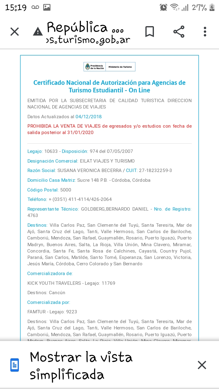 Una de las madres de estos alumnos de la escuela José de San Martín, Patricia Massa, informó a este Medio que efectivamente unos 50 chicos tendrían contratado su viaje de estudios con Eilat: “El viaje no tenía una fecha específica ya que el contrato se firmó en plena pandemia en el año 2020. Desde la empresa habían sugerido que a partir de octubre de este año se podría elegir la fecha del viaje; el mismo se podría hacer en octubre, noviembre o diciembre de este año. El precio lo congelaron a la firma del contrato en $22.800 por viajero (también iban a viajar algunos padres). Nos hicieron un plan de pagos de 16 cuotas y las mismas las empezamos a pagar en el mes de agosto del año pasado. En la cuota 12 decidimos dejar de pagar porque no tuvimos más respuestas de la empresa. Mandamos emails y no nos responden, llamamos a los números fijos de Eilat y no nos atienden y fuimos gastando todos nuestros recursos sin tener ningún tipo de respuesta de parte de ellos. Yo hace algunos días me pude comunicar con el Gerente, Lalo, vía whatsApp, y me reconoció que la empresa ya no hacía más viajes estudiantiles pero me aseguró que otra empresa, de Río Cuarto, se iba a hacer cargo de lo nuestro aunque no me dio ni el nombre de la misma. Solo me dijo que muy pronto íbamos a tener una reunión informativa. Sin embargo, nadie se comunicó con nosotros”.
