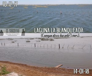 La Laguna La Blanqueada vuelve a ser noticia, en varias oportunidades dimos cuenta en esta página web de los inconvenientes que generaba el desborde de la misma, los accidentes que en ella ocurrieron, las obras demoradas y las concluidas, etc, pero en este caso volvemos a referirnos a ella para graficar el notable descenso que se puede apreciar a simple vista en los campos adyacentes e incluso en el mismo ojo de agua, que hoy a descendido casi un metro y medio de su punto máximo.