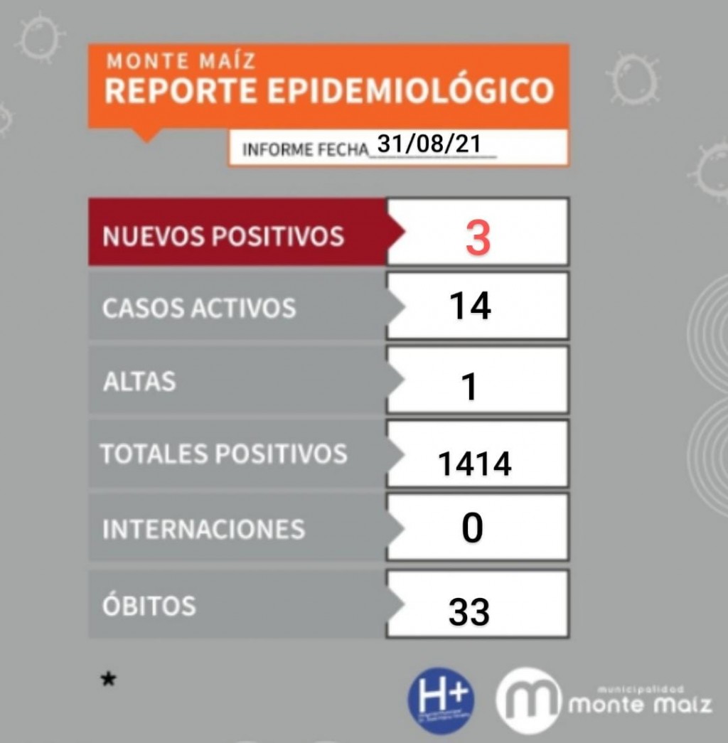 El informe epidemiológico emitido esta mañana por el Hospital Municipal, con fecha 31 de agosto, indicó 3 casos nuevos de COVID-19 en Monte Maíz y un alta médica a un paciente que se encontraba cumpliendo con el aislamiento domiciliario.