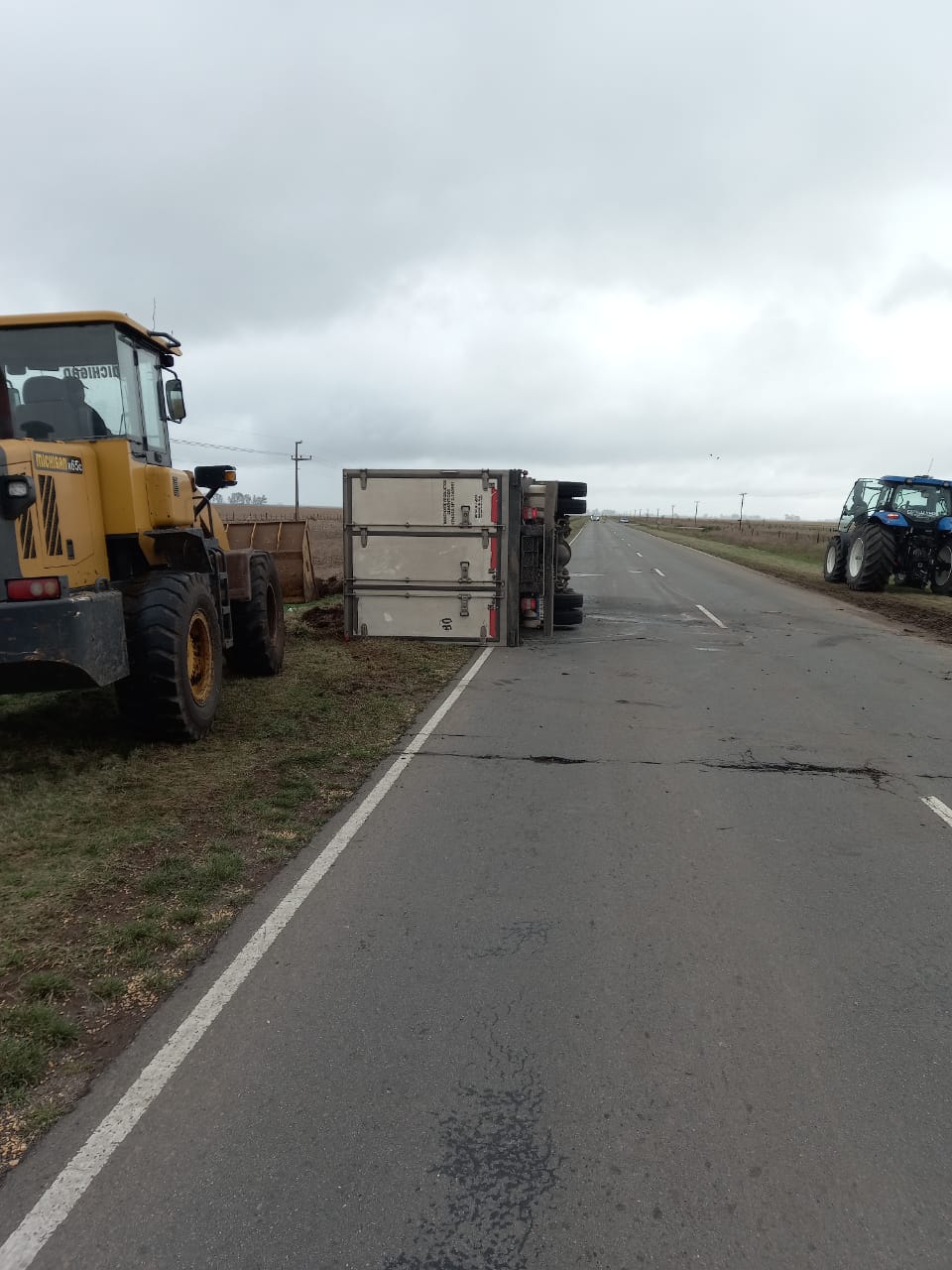 Bomberos Voluntarios procedieron a correr el camión hacia la banquina aunque quedó volcado al costado de la ruta ya que estaba cargado. Unas horas más tarde, la empresa trasbordó la carga a otro camión y los Bomberos están trabajando en el lugar tratando de levantar el transporte.