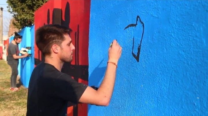 Al respecto, Nico Cucco expresó: “Fuimos convocados por el área de Cultura para pintar un mural y aceptamos encantados. Nos pusimos a pintar de noche, durante dos días, para que estuviera listo el día que llegaran los niños. Ellos también se prendieron en la obra y nos ayudaron a pintar el mural. Estoy orgulloso de poder compartir esto con los chicos y con mis compañeros de Banda también. Yo ya he hecho obras grandes pero ninguna como esta, ya que la misma tiene casi una cuadra de largo. Lo considero un trabajo en conjunto ya que yo fui quien lo inició y ellos (los niños y sus músicos) se fueron sumando durante el proceso. Aprovechamos también a pintar una leyenda con una frase de una de nuestras canciones que va a salir ahora y lo consideramos como una posibilidad de aportar nuestra manera de ver las cosas”.