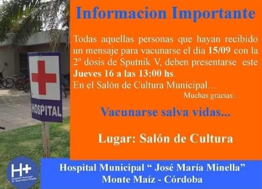 El Hospital Municipal de Monte Maíz informa a la población que todas esas personas que hayan recibido la notificación para vacunarse contra el COVID-19, con la segunda dosis de Sputnik V, el día 15 de setiembre, deberán presentarse mañana jueves 16/09 a las 13 hs. en la Casa de la Cultura. Deberán presentar el certificado de vacunación.
